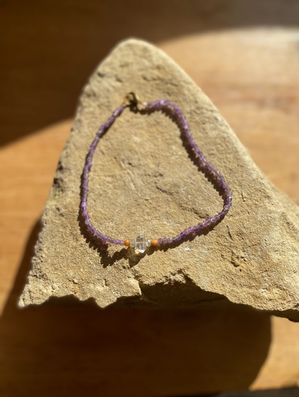 Handmade with love and intention, this one-of-a-kind anklet weaves together the serene energy of delicate amethyst stones, a powerful double-terminated quartz crystal centerpiece, and the mystical glow of faceted labradorite beads. Nestled between these semi-precious stones are two rare seeds collected from the heart of the Amazon forest, carrying the wild, grounding spirit of the Earth. Finished with a gold-colored clasp, this anklet is both a sacred talisman and an elegant adornment — perfect for grounding, clarity, and transformation.
