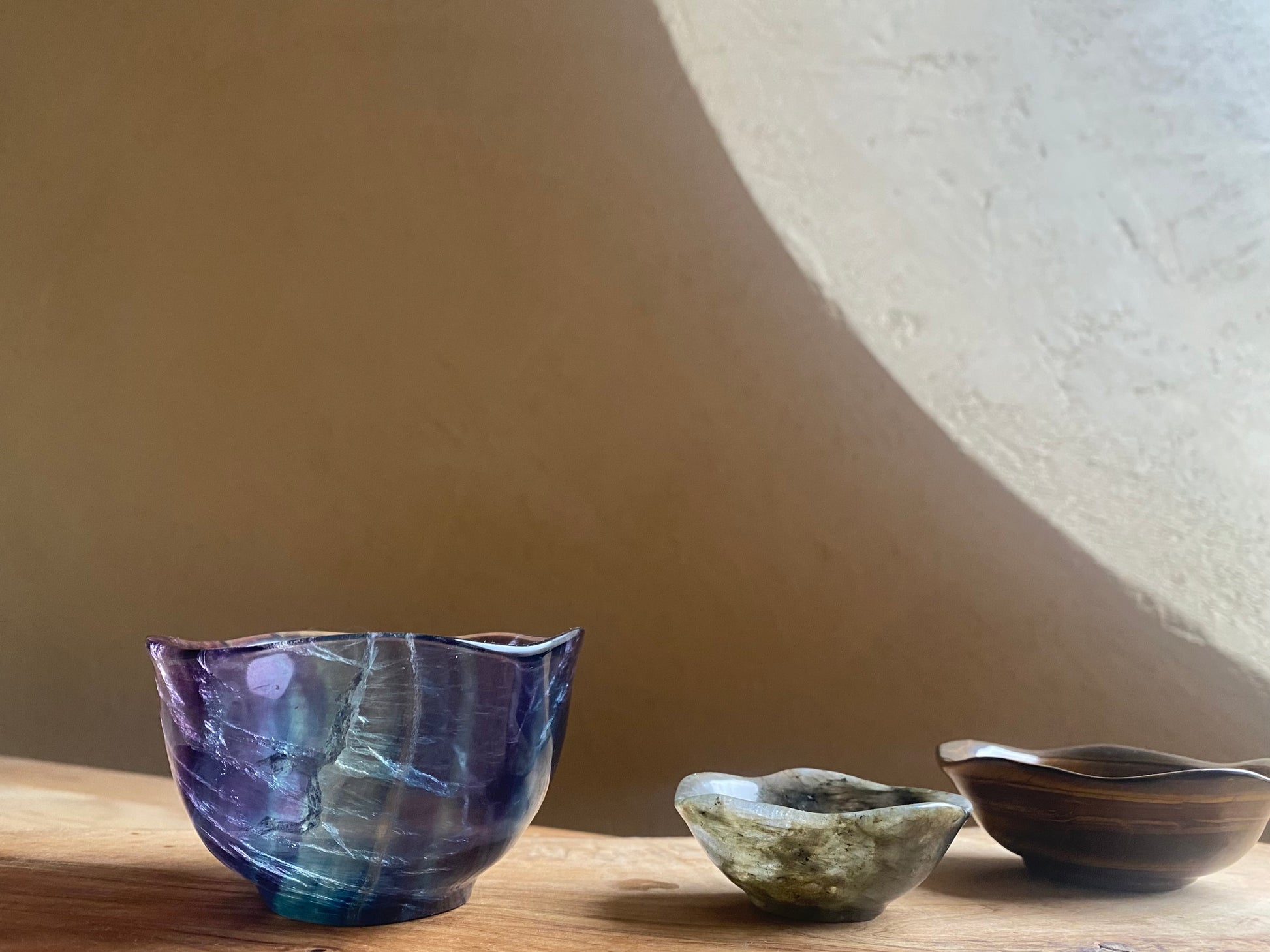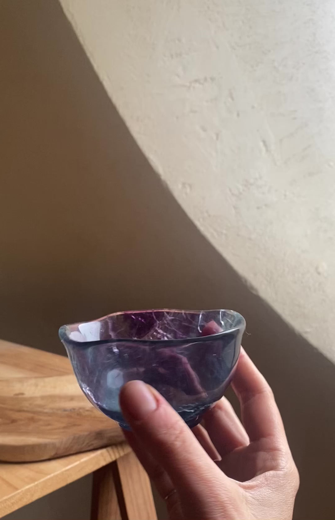 Hand-Carved from fluorite gemstone, this exquisite bowl features luminous shades of violet and turquoise. Its stunning, natural beauty makes it a perfect addition to any space in your home. Functional yet elegant, this bowl can also be used to hold and cleanse your favorite jewelry pieces.