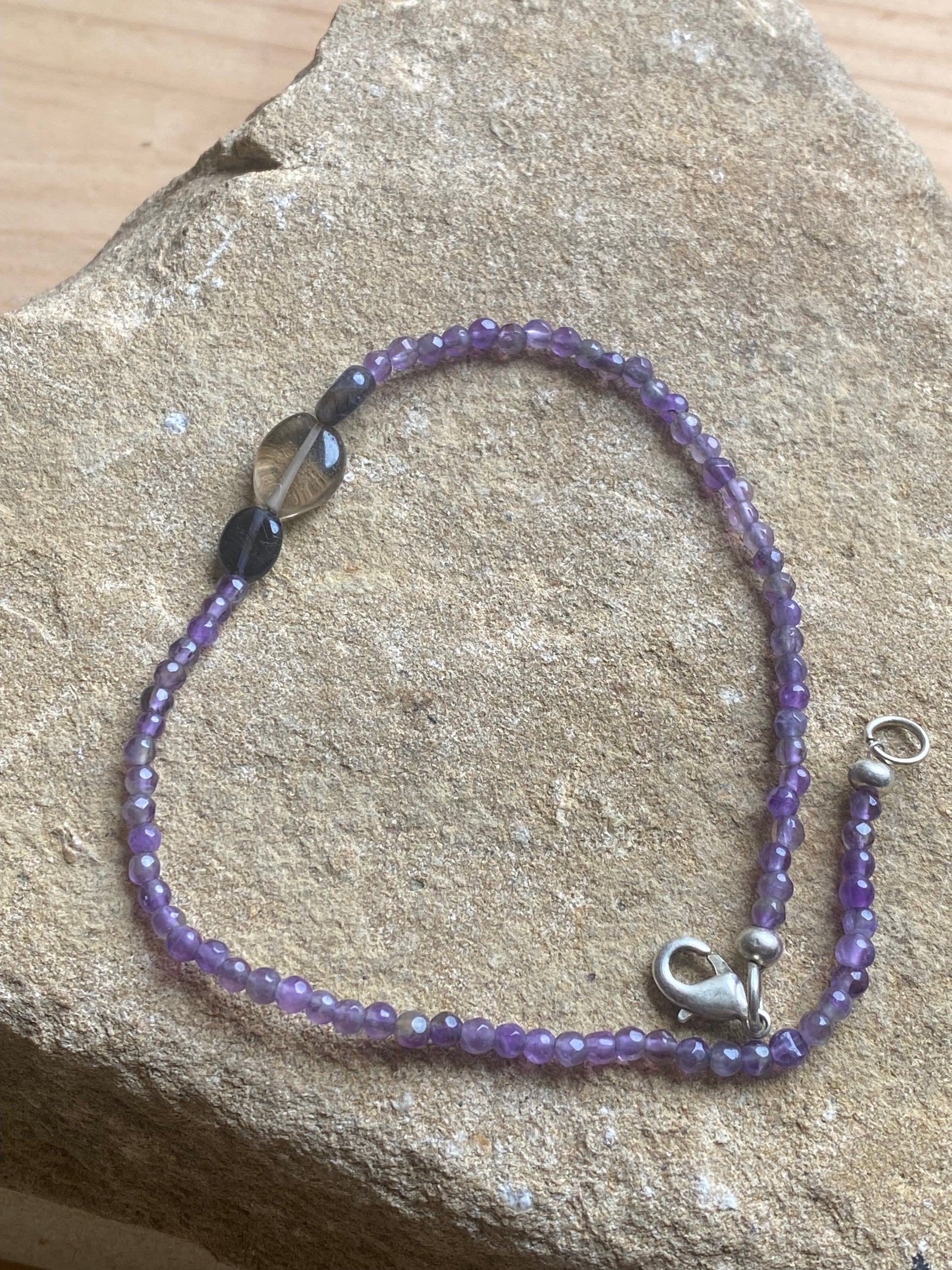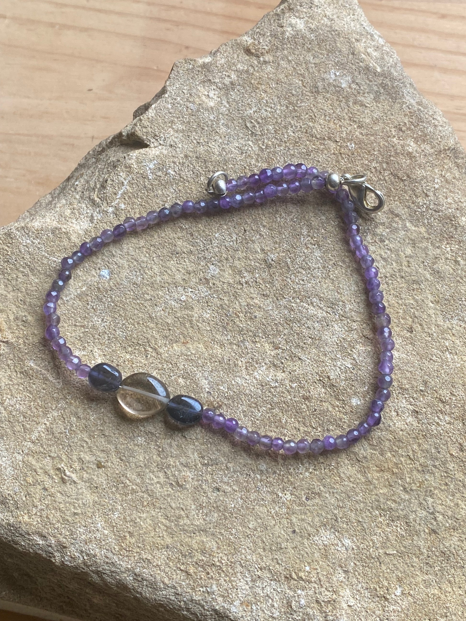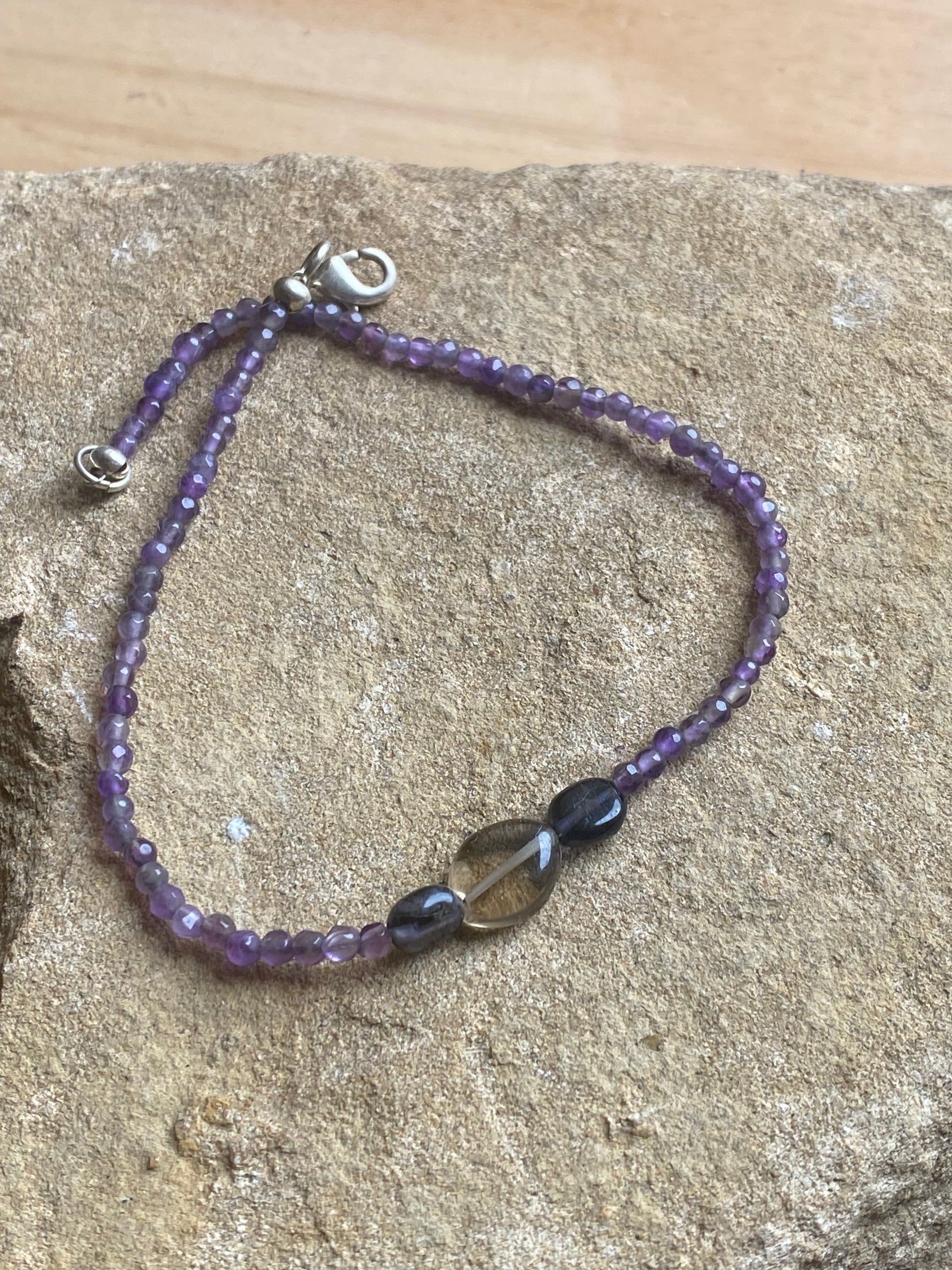 This delicate anklet is handcrafted with tiny amethyst beads that shimmer in gentle hues. At its center lies a grounding smoky quartz crystal, two deep iolite stones—known for their connection to intuition and inner vision. The energy of this trio balances calm, clarity, and insight, making it a beautiful companion for quiet strength and alignment. Finished with a sterling silver clasp, this piece offers elegance with a touch of protection.