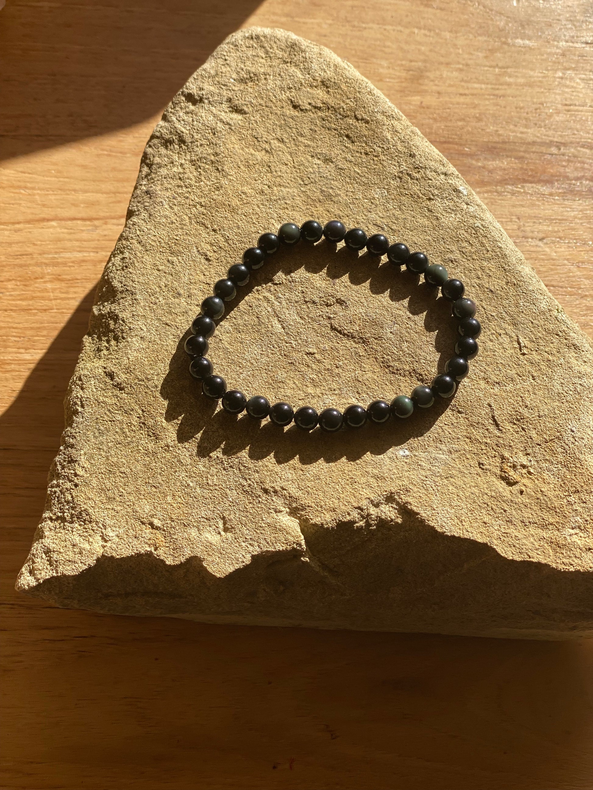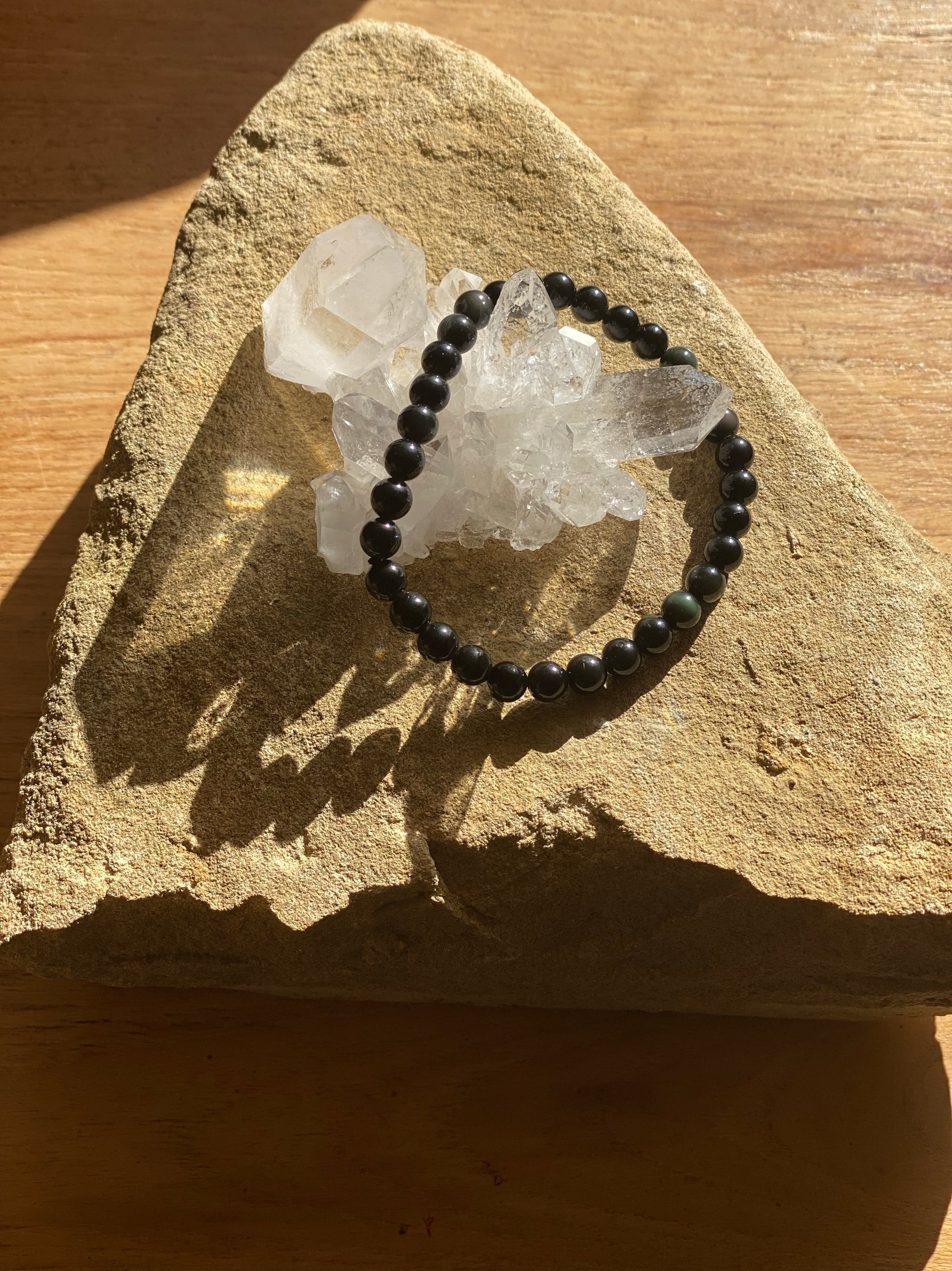 Rainbow obsidian is a black stone made from volcanic glass with deep rainbow reflections. It is a powerful stone for grounding and protection. It can be helpful in clearing negative energy and releasing the past. It is known for aiding in creativity and connecting to your inner fire. It is a stone for courage and releasing fear.