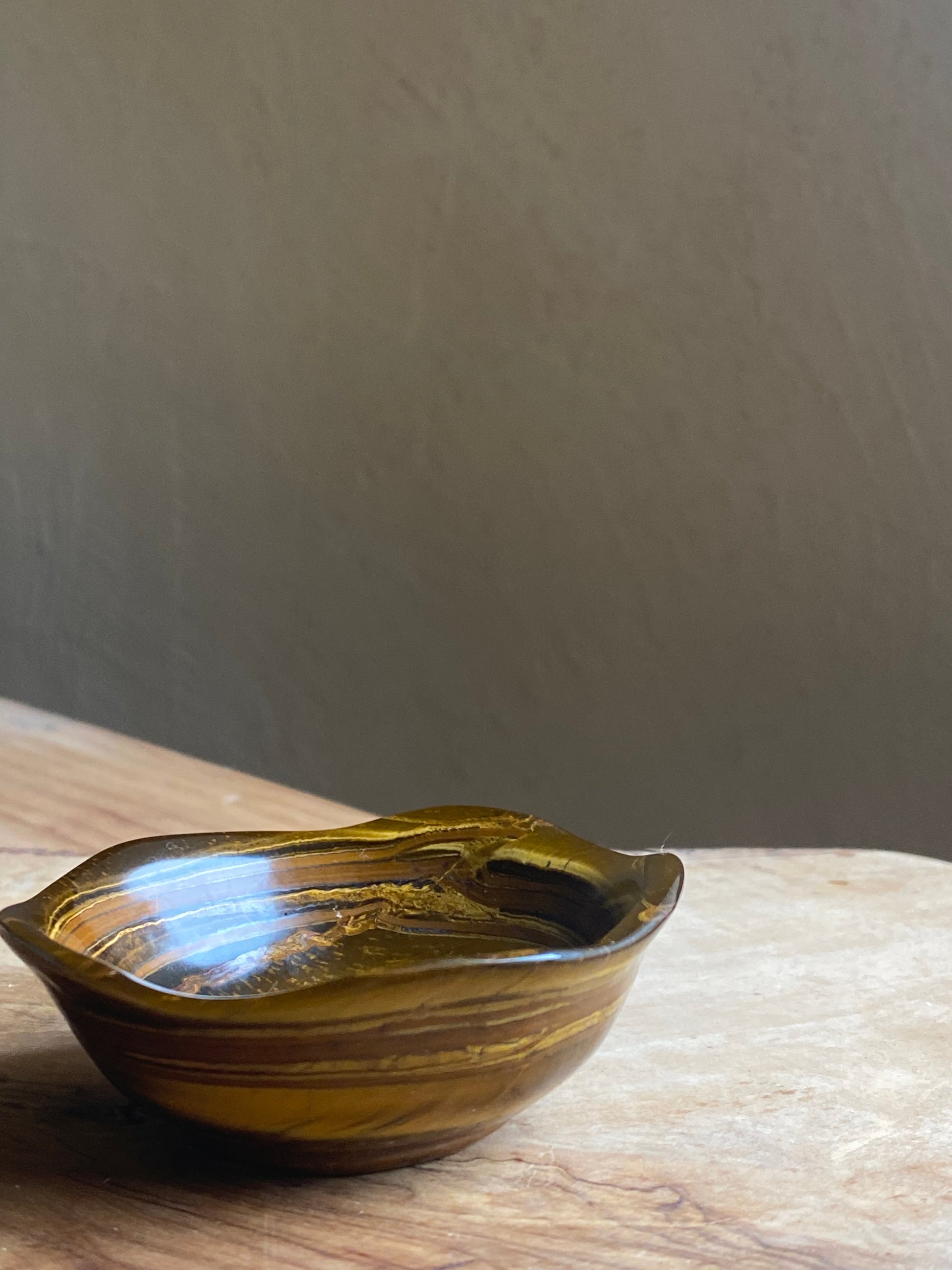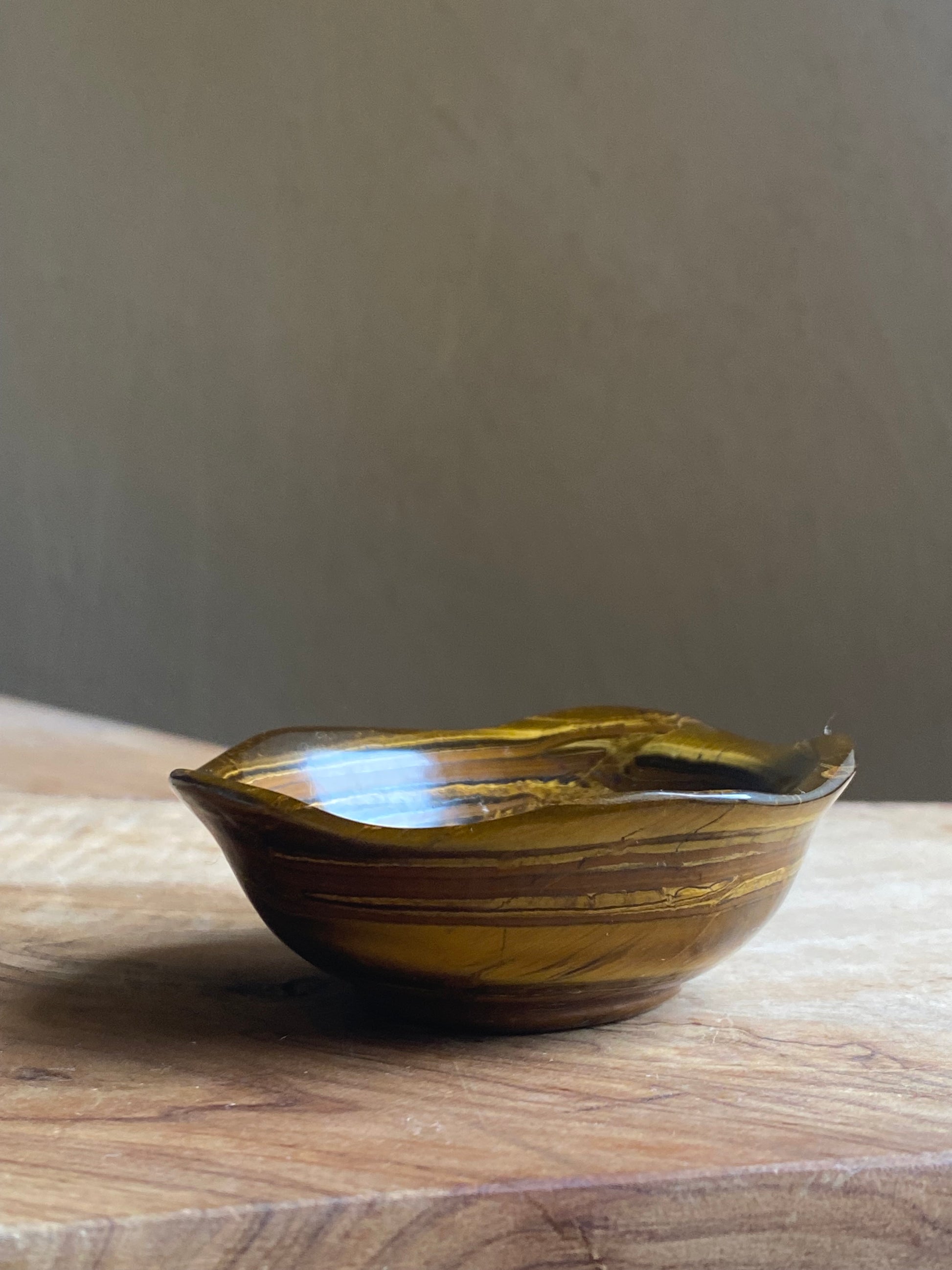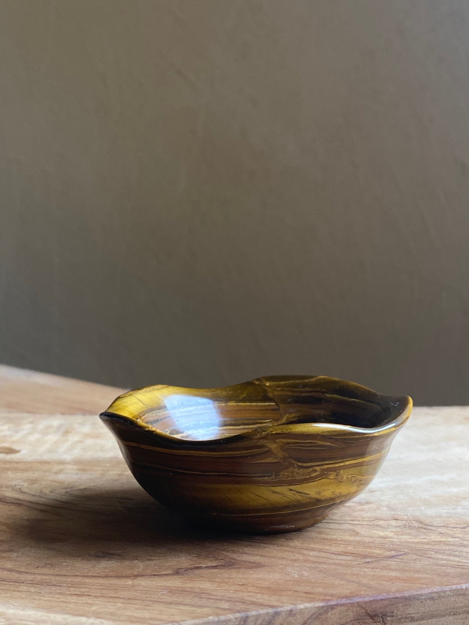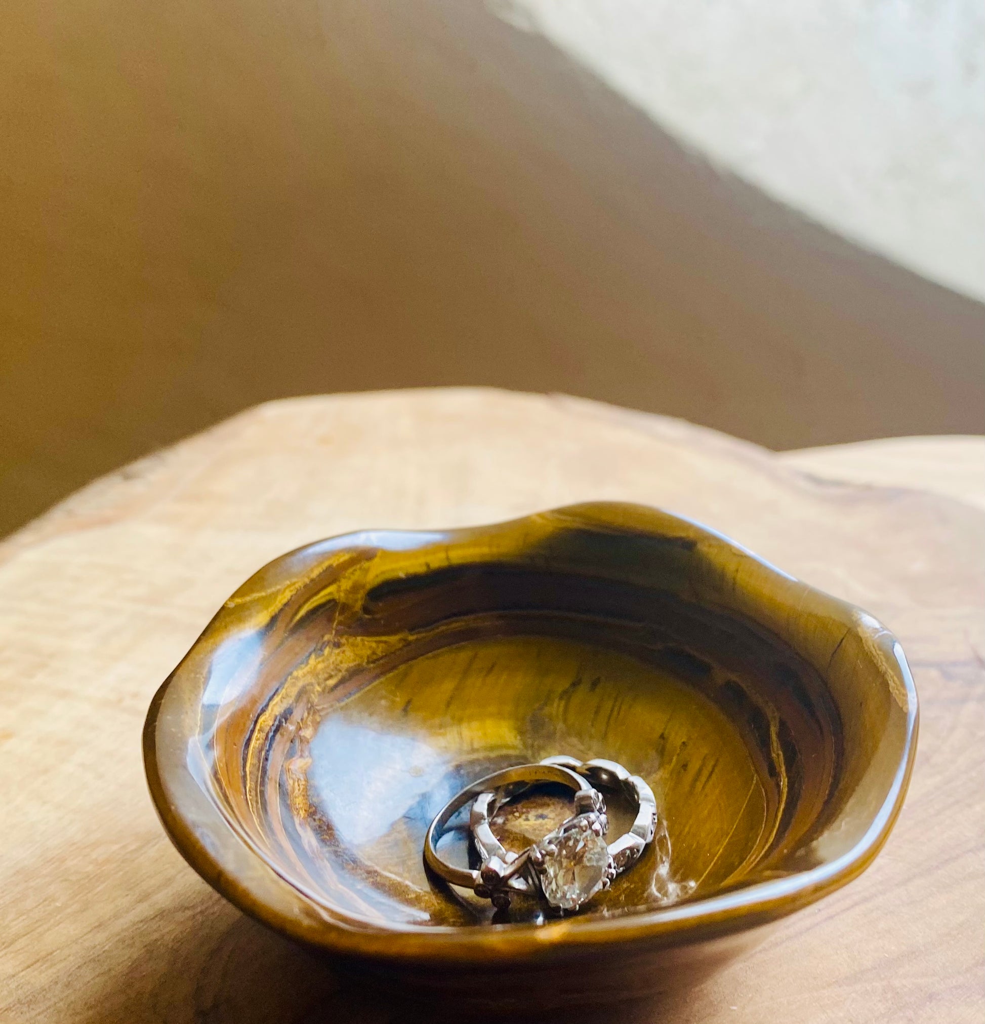 Hand-carved from Tiger’s Eye, a stunning semi-precious stone, this bowl serves as an elegant decorative piece or a perfect holder for your jewelry. Its natural beauty and intricate craftsmanship make it a versatile and timeless addition to any space.
