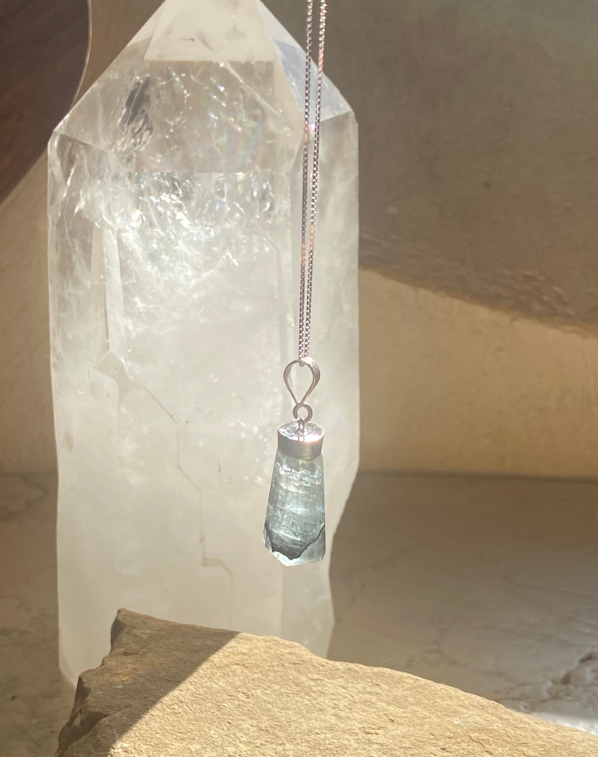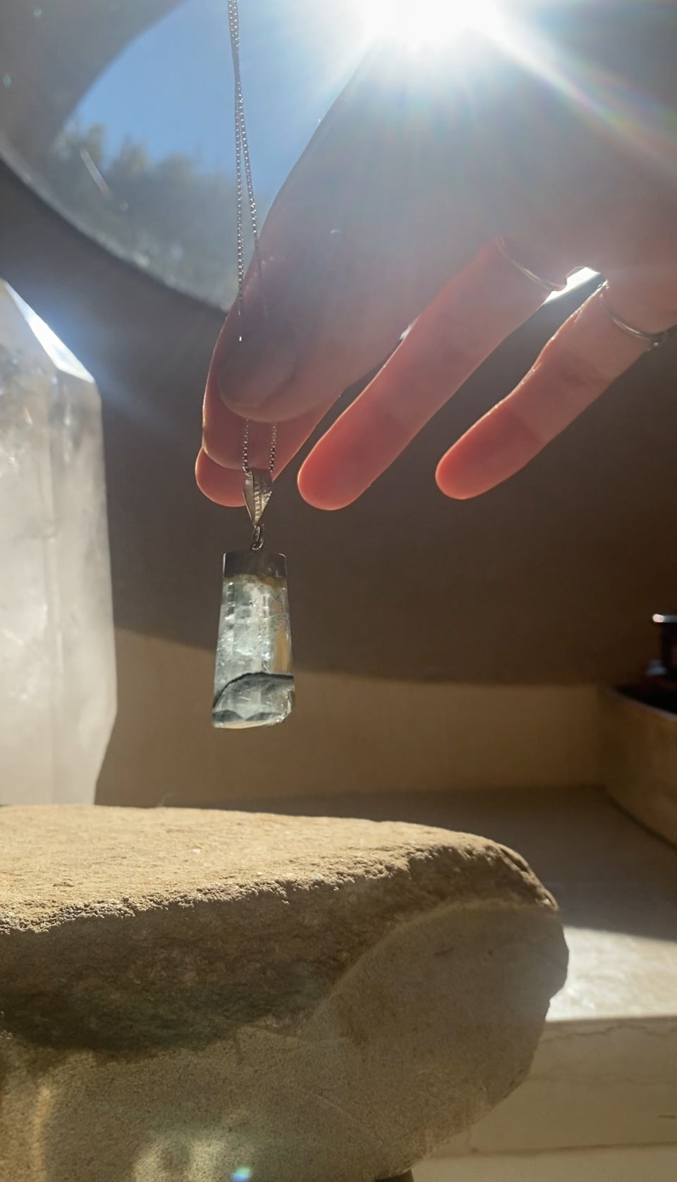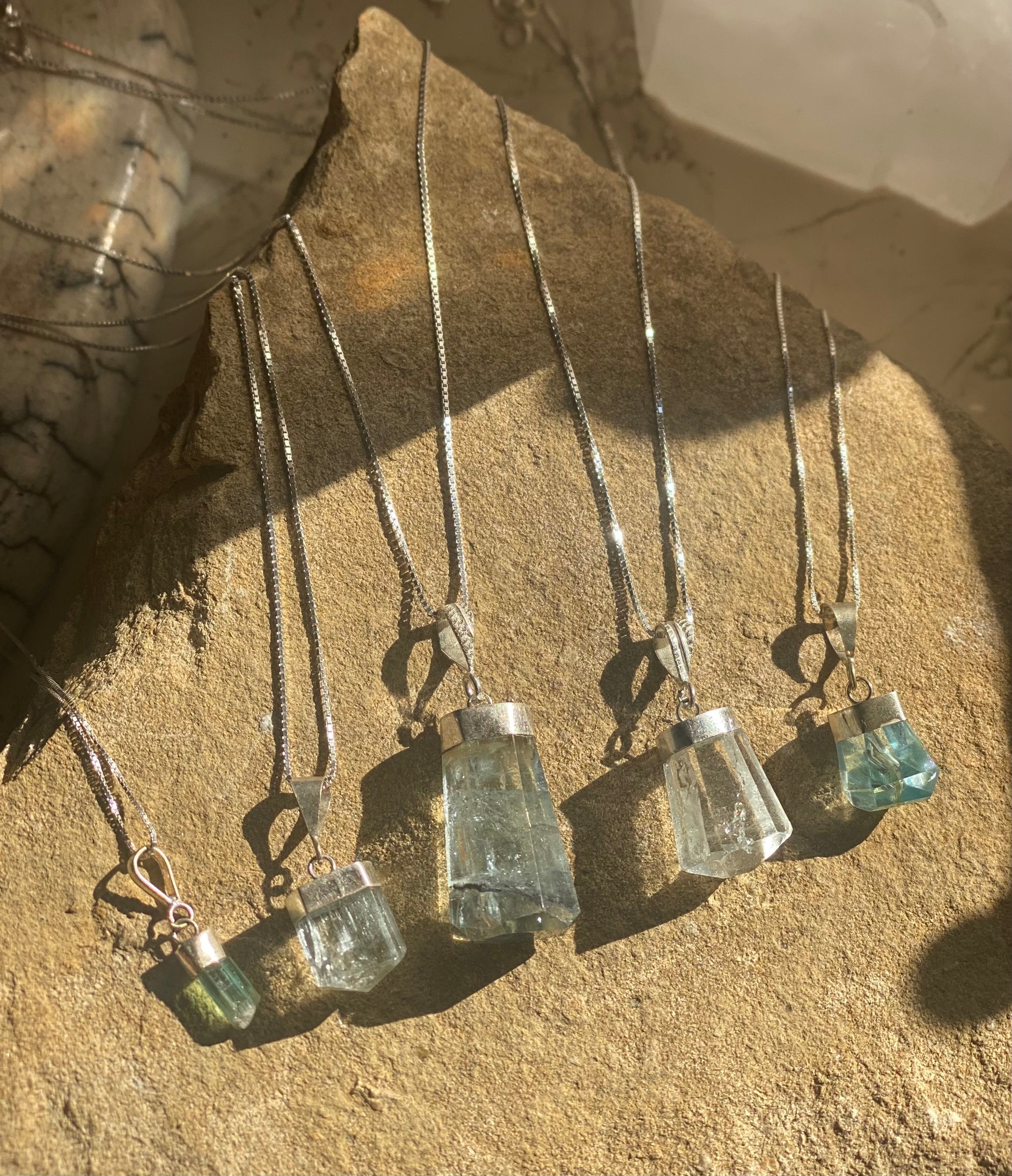 A serene aquamarine pendant with delicate natural inclusions that catch the light. Its pale blue tone evokes the sea and sky.